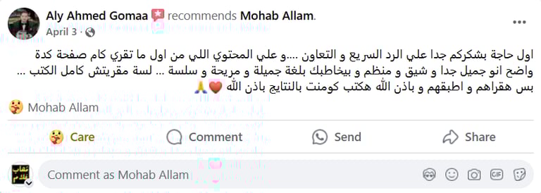 اشكرك علي المحتوي اللي من اول ما تقري كام صفحة كدة واضح انو جميل جدا و شيق و منظم و بيخاطبك بلغة جميلة و مريحة و سلسة … اشكرك جدا و كاققل تقدير هعمل recommend ليكم اشكرك